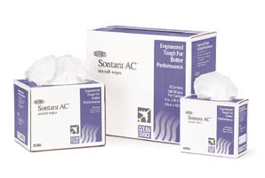 Sontara* AC* Aircraft Wipers^ Launderable. Nonwoven. For manufacturing applications. DuPont* Sontara* fabric. Absorbent, solvent-resistant, low-linting for snag resistance. Interleaved polyester/cellulose blend, creped texture. No metal particles. Color: white. Pop-up box. Size: 30.5x41.9cm.