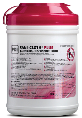 PDI* Sani-Cloth* Plus Germicidal Disposable Wipes^ With 14.85% alcohol. Kills TB, MRSA, VRE, HIV-1, Staphyloccocus aureus, Salmonella cholerasuis, Pseudomonas aeruginosa, Influenza A2/Hong Kong, Escherichia coli (pathogenic strain), Herpes Simplex Type 2. Meet EPA, CDC, OSHA guidelines. 15.2x17cm.