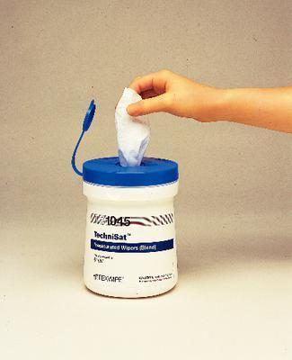 TechniSat* CleanPaks* Sterile Presaturated Wipers^ Nonwoven, hydroentangled 45% polyester/55% cellulose. High absorbency and bidirectional strength. Low extractables. Pre-wetted with 70% 0.2um-filtered semiconductor-grade 2-propanol and 30% 18megohm deionized water. 100 wipers/canister. 15.2x20.3cm.