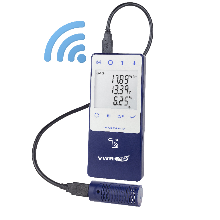 VWR® TraceableLIVE® is the simple, efficient, and reliable way to stay connected to critical environments, wherever you go., With TraceableLIVE®, stay connected to the lab with a smartphone, tablet, or personal computer. By simply using the TraceableLIVE® app, or visiting Traceablelive.com on any browser, users can view current humidity and temperatures, control alarm parameters, view datalogging history, and view and generate reports. TraceableLIVE® Standard and Premium subscription plans are now available on vwr.com (https://us.vwr.com/store/product/35955573/traceablelive-subscription-coupon-codes-cole-parmer)., 04_BodyText: AC power runs unit-batteries designed as back-up power in case of a power-outage. Ambient probe and cable probe units available. Multiple point calibration, including CO₂, temperature, and humidity; all traceable to NIST. Default WiFi transmission frequency is 15 minutes with the cable length of 42"., 02_BulletPoint: Monitor CO₂ levels, temperature, and humidity readings locally and remotely by connecting to existing Wi-Fi | Simultaneously monitor CO₂, temperature, and humidity; perfect for CO2 incubators, microbiology labs, office and warehouse space, and greenhouses | Alerts: CO₂ alarm, humidity alarm, temperature alarm, connectivity interruption, low battery | Cloud-based data interface with no local software required; web, Android, Apple IOS data visibility | Continuous data transmission and monitoring using SSL encrypted SECURE connection | Receive Mobile Push, Email, or Text notifications | Unlimited scalability; use TraceableLIVE® in individual labs or an entire network of facilities, 08_Certifications: CE marked. RoHS compliant. Traceable to NIST for accuracy. Multi-point calibration on an individually-numbered Traceable® Certificate which assures accuracy from an ISO/IEC 17025:2005 (1750.01) calibration laboratory accredited by A2LA. It indicates traceability of measurements to the SI units through NIST or other recognized national measurement institutes (NMI) that are signatories to the CIPM mutual recognition agreement., 10_Ordering: Units are supplied with probe, quick start guide, batteries, wall mount, Velcro®, magnetic strips, hook and loop tape and an ISO 17025 Traceable® certificate., Resolution: T: 0.01 °C | RH: 0.01% | CO₂: 0.01%, Interface: WiFi, VWR® TraceableLIVE® is the simple, efficient, and reliable way to stay connected to critical environments, wherever you go., With TraceableLIVE®, stay connected to the lab with a smartphone, tablet, or personal computer. By simply using the TraceableLIVE® app, or visiting Traceablelive.com on any browser, users can view current humidity and temperatures, control alarm parameters, view datalogging history, and view and generate reports. TraceableLIVE® Standard and Premium subscription plans are now available on vwr.com (https://us.vwr.com/store/product/35955573/traceablelive-subscription-coupon-codes-cole-parmer)., 04_BodyText: AC power runs unit-batteries designed as back-up power in case of a power-outage. Ambient probe and cable probe units available. Multiple point calibration, including CO₂, temperature, and humidity; all traceable to NIST. Default WiFi transmission frequency is 15 minutes with the cable length of 42"., 02_BulletPoint: Monitor CO₂ levels, temperature, and humidity readings locally and remotely by connecting to existing Wi-Fi | Simultaneously monitor CO₂, temperature, and humidity; perfect for CO2 incubators, microbiology labs, office and warehouse space, and greenhouses | Alerts: CO₂ alarm, humidity alarm, temperature alarm, connectivity interruption, low battery | Cloud-based data interface with no local software required; web, Android, Apple IOS data visibility | Continuous data transmission and monitoring using SSL encrypted SECURE connection | Receive Mobile Push, Email, or Text notifications | Unlimited scalability; use TraceableLIVE® in individual labs or an entire network of facilities, 08_Certifications: CE marked. RoHS compliant. Traceable to NIST for accuracy. Multi-point calibration on an individually-numbered Traceable® Certificate which assures accuracy from an ISO/IEC 17025:2005 (1750.01) calibration laboratory accredited by A2LA. It indicates traceability of measurements to the SI units through NIST or other recognized national measurement institutes (NMI) that are signatories to the CIPM mutual recognition agreement., 10_Ordering: Units are supplied with probe, quick start guide, batteries, wall mount, Velcro®, magnetic strips, hook and loop tape and an ISO 17025 Traceable® certificate., Sensor: Ambient, Weight: 113 g, W×D×H: 108×70×19 mm (4.25×2.75×0.75"), Cat. No.: 76047-264, Accuracy: T: ±0.4 °C | RH: ±3% (5 - 75%), otherwise ±5% | CO₂: 4% reading plus 1% full scale, Range: T: 0… 50 °C (32… 122 °F) | RH: 0 - 95%, non-condensing | CO₂: 0 - 20%, Resolution: T: 0.01 °C | RH: 0.1% | CO₂: 1 ppm, Interface: WiFi, VWR® TraceableLIVE® is the simple, efficient, and reliable way to stay connected to critical environments, wherever you go., With TraceableLIVE®, stay connected to the lab with a smartphone, tablet, or personal computer. By simply using the TraceableLIVE® app, or visiting Traceablelive.com on any browser, users can view current humidity and temperatures, control alarm parameters, view datalogging history, and view and generate reports. TraceableLIVE® Standard and Premium subscription plans are now available on vwr.com (https://us.vwr.com/store/product/35955573/traceablelive-subscription-coupon-codes-cole-parmer)., 04_BodyText: AC power runs unit-batteries designed as back-up power in case of a power-outage. Ambient probe and cable probe units available. Multiple point calibration, including CO₂, temperature, and humidity; all traceable to NIST. Default WiFi transmission frequency is 15 minutes with the cable length of 42"., 02_BulletPoint: Monitor CO₂ levels, temperature, and humidity readings