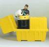 Double Drum Secondary Containment Workstation^ Heavy-duty polyethylene unit in safety yellow holds two 208L drums. Use as collection station or dispensing center for most hazardous chemicals. 454L secondary spill capacity. Forkliftable. Comes with locks. Meets EPA 40CFR 264.175. 152Wx86Dx116Hcm.
