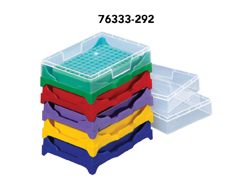 These racks accommodate 96-well PCR plates and 8 or 12 strip tubes., Operating Temperature: –80 to 121 °C (maximum), 02_BulletPoint: Stackable | Lid locks into place | Stable work platform, 11_Delivery: Supplied with one lid per rack., Color: Standard blue, green, red, violet, yellow, Dimensions: 138×98×39 mm, Cat. No.: 76333-292, For tubes: 1×96-Well Plate, 90×0.2 ml tubes or 12×8-strip tubes, Final SAP Desc Link: 37186256, SAP Description Status: Ready, These racks accommodate 96-well PCR plates and 8 or 12 strip tubes., Operating Temperature: –80 to 121 °C (maximum), 02_BulletPoint: Stackable | Lid locks into place | Stable work platform, 11_Delivery: Supplied with one lid per rack., Final SAP Desc Link: 37186256, SAP Description Status: Ready