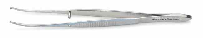 Iris Forceps, 1 x 2 teeth, 10cm, 0.8 mm curved tip (German-made)