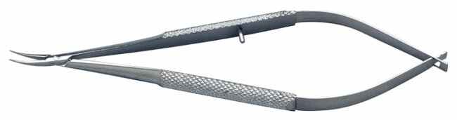 Needle Holder, round handle, 14cm, 0.4mm tip, curved smooth jaws (German-made)