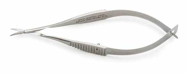 McPherson-Vannas Scissors, 8cm, curved 5mm blade, 0.1 mm tip (German-made)