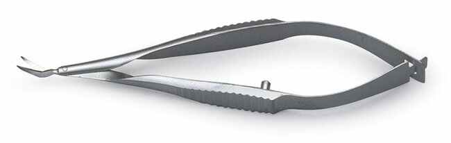 Vannas Scissors, 8 cm (3), 5 mm Long Blades, 0.1 mm Angled Tips, Stainless Steel, WPI Premium, Each
