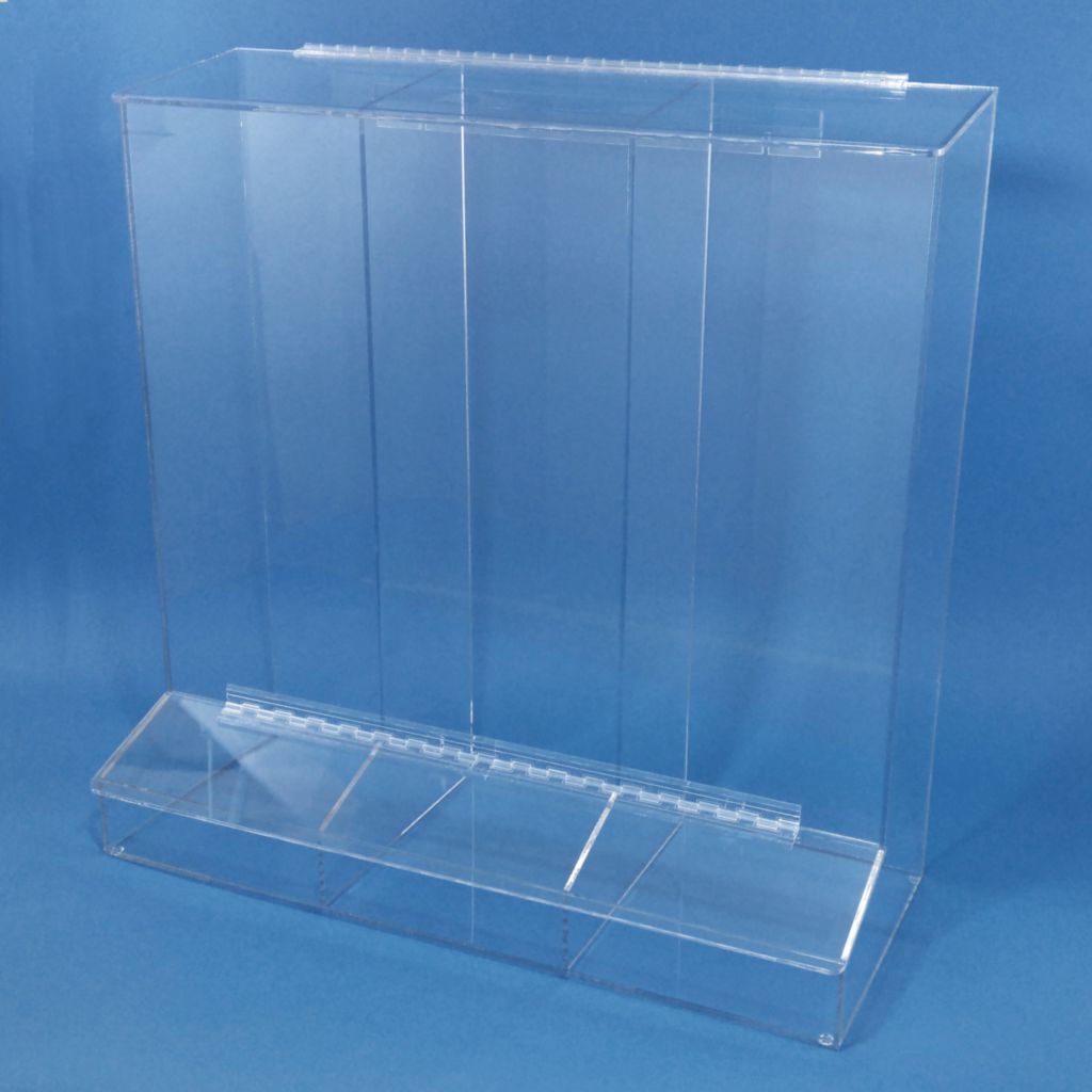 X-Large 3 Comprtmnt Disp With Tray & Lid^ Glove Dispensers For Multiple Sizes Or Styles Of Gloves, Sloped Lid And Solid Front With 3 Compartments, With Access Tray, With Lid, 1/4 Inch Clear Material: Acrylic, Dimension (Width Xheight Xdepth): 30X30X12Inch